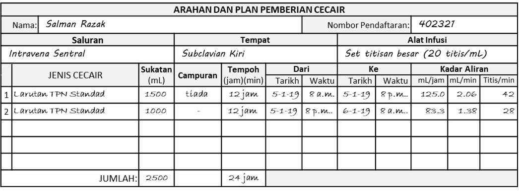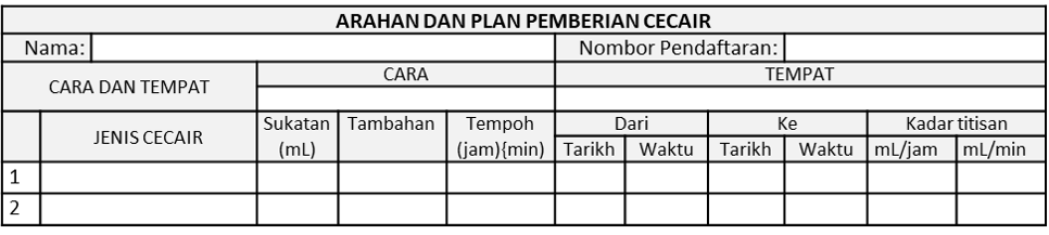 Untuk lebih jelas eloklah doktor menulis arahan dan juga plan pada lampiran yang sama seperti ditunjukkan dibawah. Jururawat hanya perlu mengira kadar aliran. Gunapakai cara ini tertakluk kepada polisi hospital berkenaan.