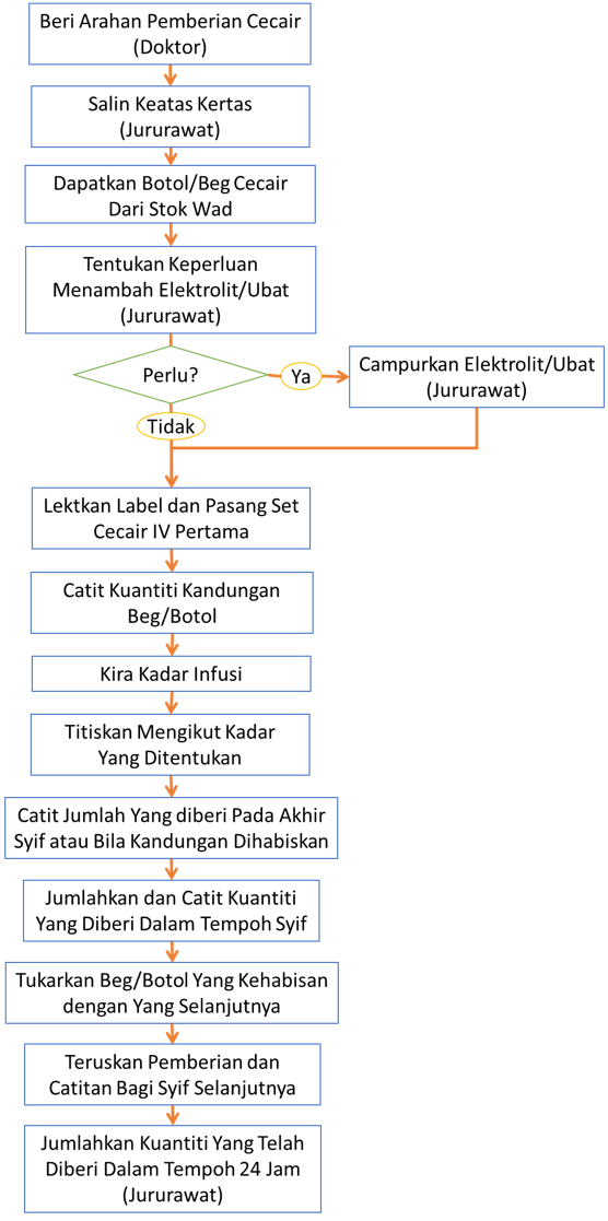 Proses rawatan pemberian cecair kepada pesakit bermula dengan arahan dari doktor yang menjaga. Selepas itu, dua jenis borang/carta perlu digunakan ia-itu borang perancangan dan carta untuk merekod pelaksanaannya. Kandungan masing masing adalah seperti berikut: