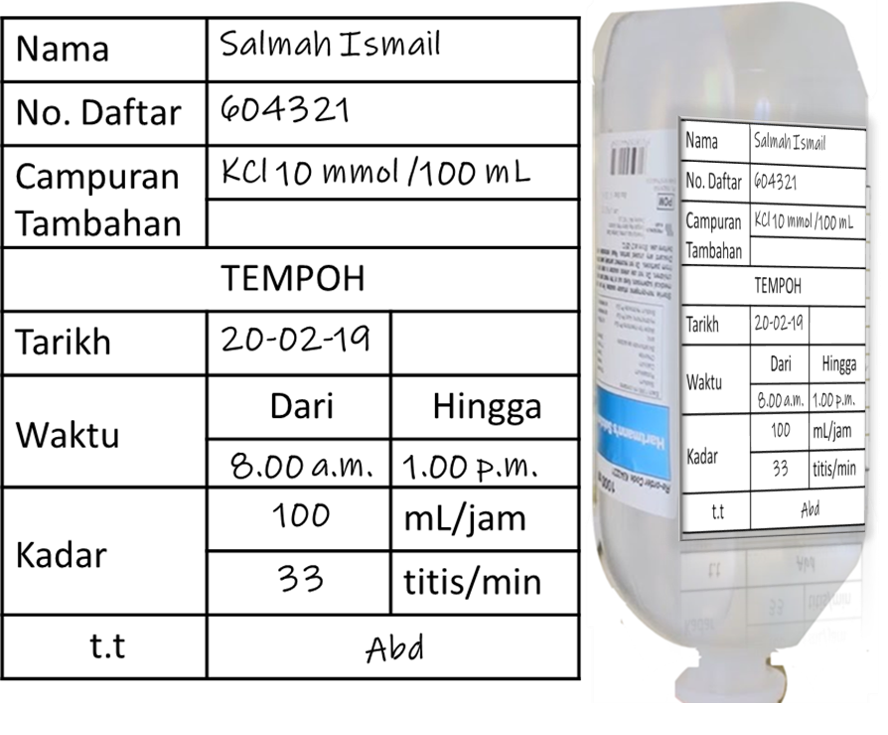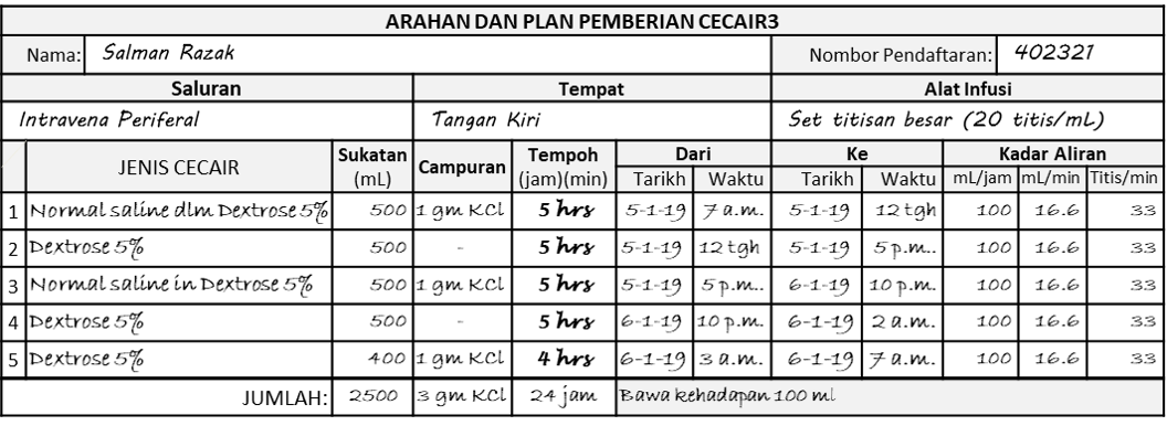 Jururawat akan membahagikan 2500 mL dengan 24 jam (satu botol dianggap mengandungi 500 mL). Dia mungkin memberi 1500 mL Dextrose 5% dahulu sebelum memberi 1000 mL Normal Saline. Sebaliknya, doktor mengaharapkan, jururawat memberi Normal saline dahulu dan diselang selikan dengan Dextrose 5%. Andaian juga dibuat disini bahawa jururawat akan memcampurkan 1 gm KCl kedalam 500 mL cecair. Cara yang lebih baik tetapi masih tidak tepat adalah seperti berikut: