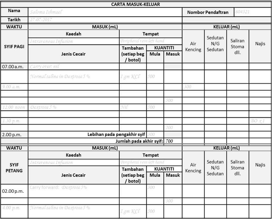 - Kemasukan – Aktiviti pelaksanaan termasuk berapa banyak, serta kekerapan cecair diberi/diambil serta urutannya