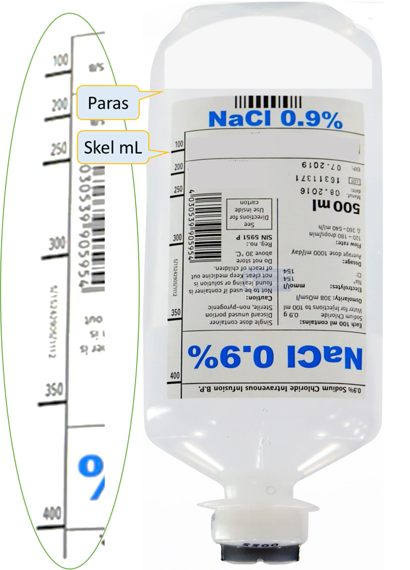 Oleh kerana Normal saline digunakan melalui semburan menggunakan syringe kuantiti nya perlu direkod. Waktu ini dbuat, waktu rehat bermula dianggap sebagai sama. Waktu beg seterusnya dipasang dan dialirkan bermuala selepas tempoh rehat.