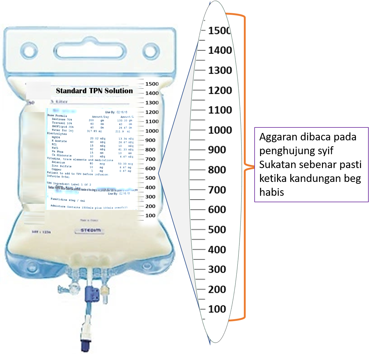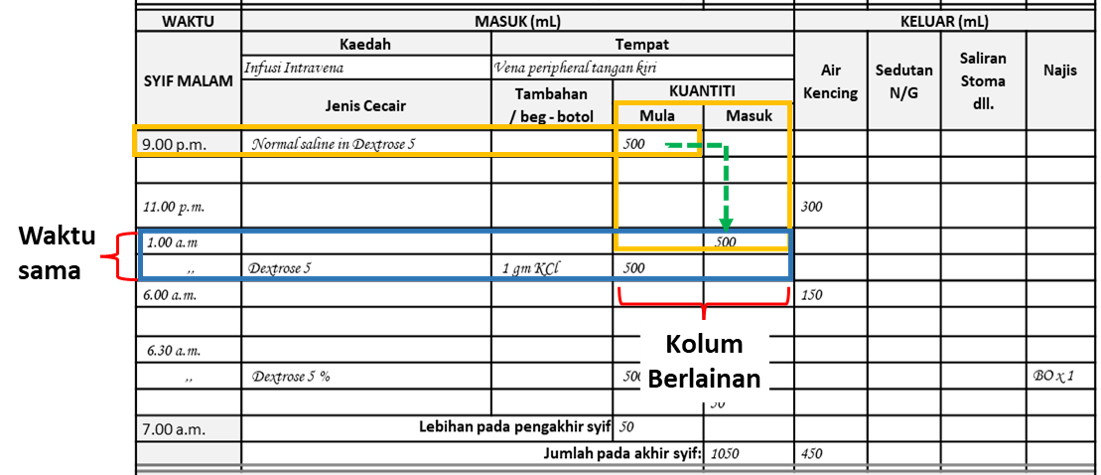 Bila infusi bermula dan kuantiti kandunagn beg direkod sejajr dengan Kuantiti – Mula. Kuantiti – Masuk direkodkan sejajar dengan waktu bila beg habis atau pada penghujung syif.