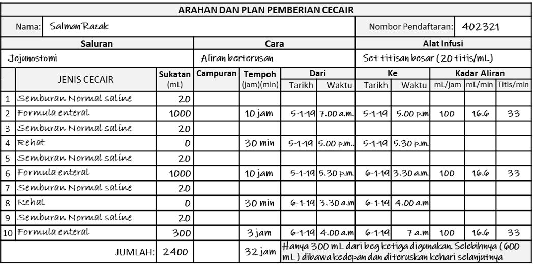 Contoh Carta Bila Cecair Diberi Melalui Saluran Enteral dan Intravena