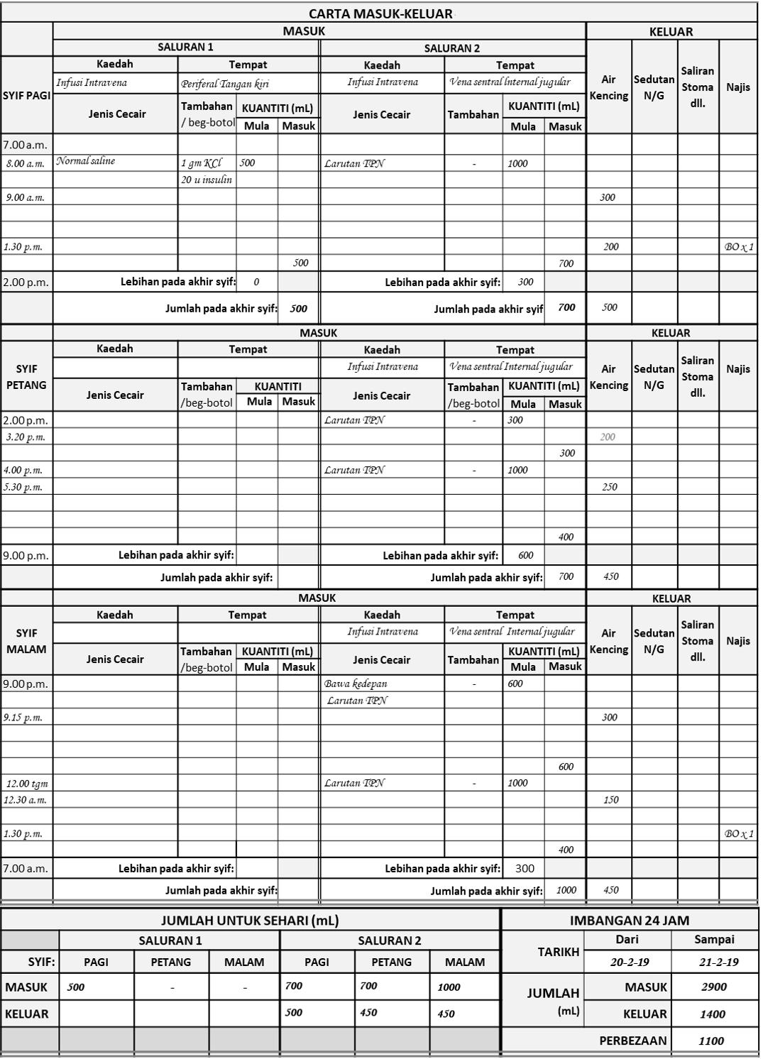 Adalah baik jika carta Masuk-Keluar Cecair yang sama digunakan samada untuk tujuan pemberian melalui saluran intravena atau saluran enteral.