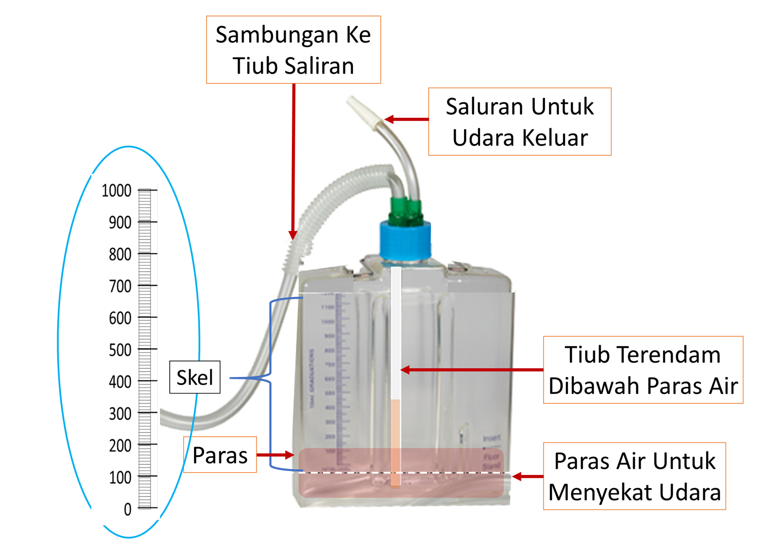 Bagi mengalirkan cecair dari ruang , udara perlu disekat dari masuk dari luar kedalam pleura. Untuk tujuan ini, penghujung tiub saliran perlu diletakkan dibawah paras air. Oleh itu, pada mulanya botol saliran sudah mengandungi air hingga keparas permulaan skel (0 mL) dan hanya kuantiti selepas paras ini dikira.