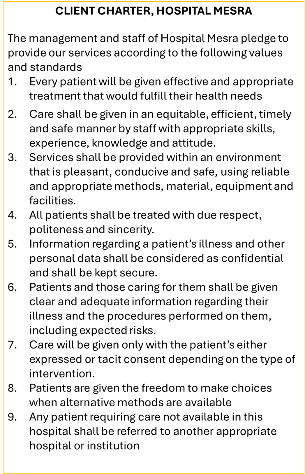 - the service delivery facilities (Supervisor of Outpatient, Inpatient, Daycare, and Operation theatre services etc.)