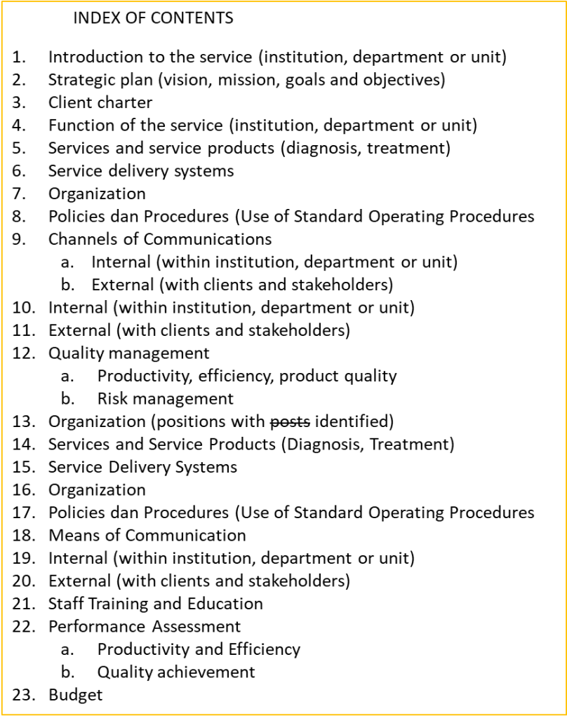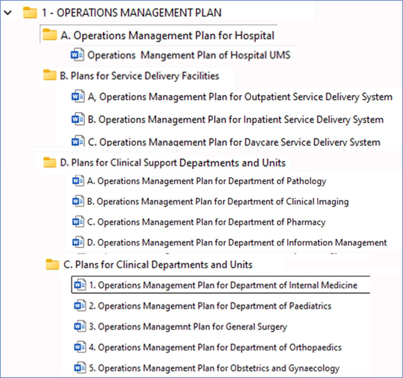 The Operations Management Plan for the institution (e.g. hospital) is the lead (mother) plan. It must be supplemented by the plan for various facilities, departments or units under it. Variations will be explained and examples given in this article. Then, to enable the delivery of services this plan must be supported by Standard Operations Procedures (SOP) for each service product it offers. The SOP should describe how the service product is to be delivered to clients in a safe, effective, and efficient manner. The plans are arranged according to the following hierarchy.
