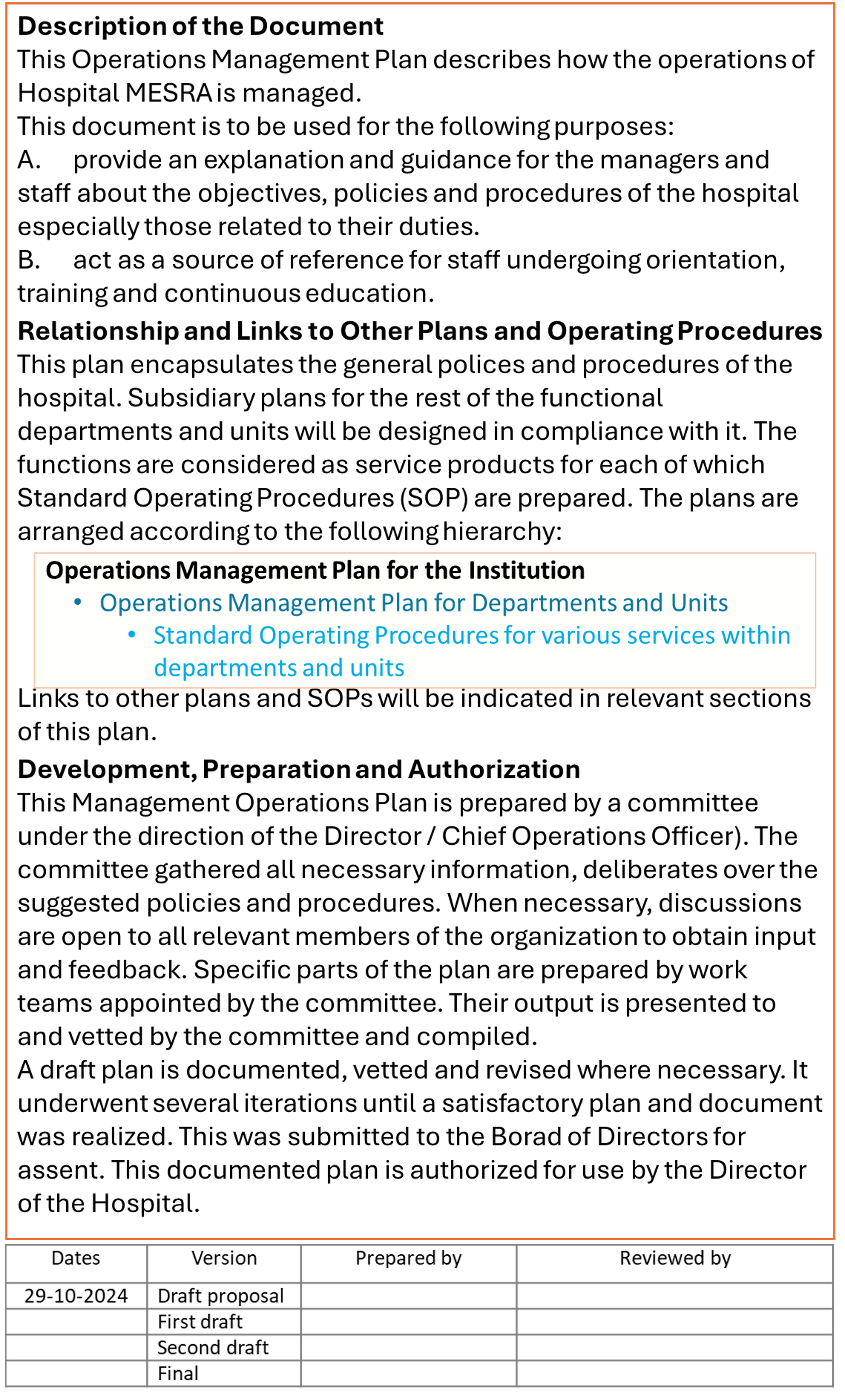 In a service industry like healthcare, the equivalent term for operations is service delivery. It is essential that the institution develop a documented plan on how to run its business operations, and that of departments or units. The plan may have various names but is here named as the ‘Operations Management Plan’ (OMP).
