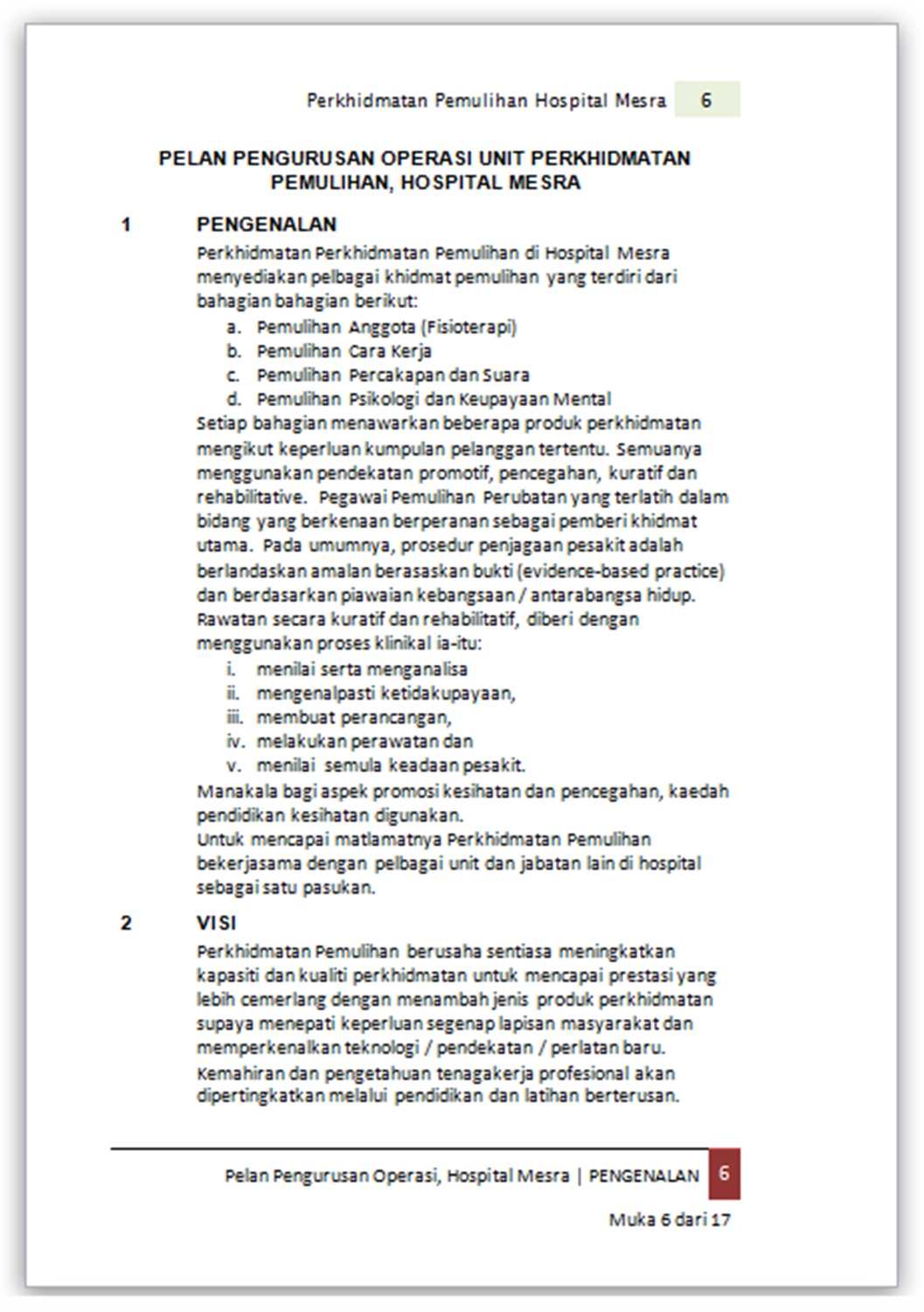 Jika dokumen ini disediakan oleh unit/jabatan dalam sebuah fasiliti/institusi besar ia perlulah selaras dan mengambilkira visi/misi/objektif badan induk itu.