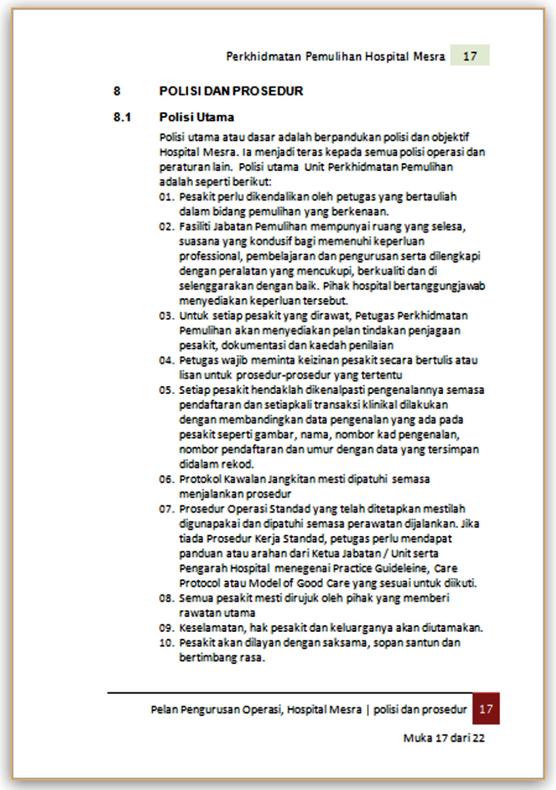 Didalam dokumen ini, hanya perlu disenaraikan nama Prosedur Operasi Standad yang ada. Nyatakan juga tatacara yang perlu dikuti bagi sesuatu tugas yang tiada prosedur yang bertulis.