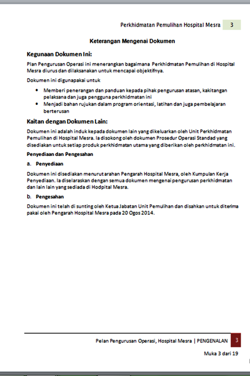 Dibawah tajuk ‘Kaitan dengan dokumen lain’ perlu disebutkan bahawa ianya adalah dokumen induk kepada semua dokumen yang disediakan di unit/jabatan/perkhidmatan. Jika unit ini adalah sebahagian dari sebuah fasiliti/institusi besar, fasiliti/institusi tersebut sepatutnya telah menyediakan Pelan Pengurusan Operasinya sendiri.