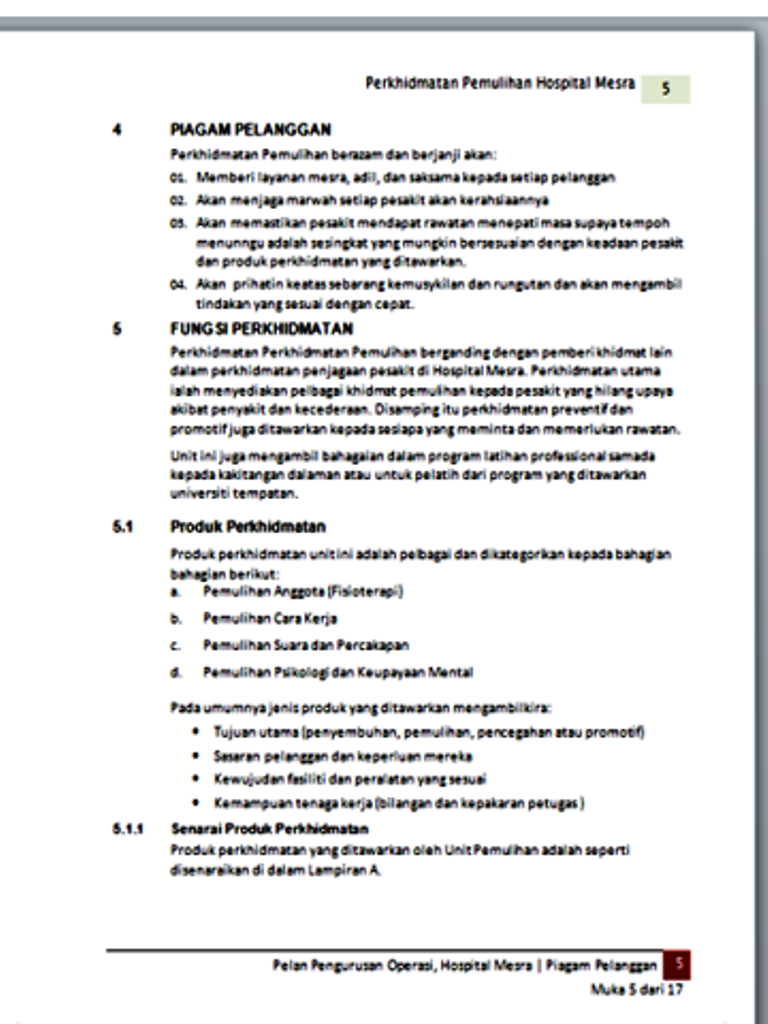 - Tindakan pembetulan dan penambahbaikan bagi sebarang kegagalan menepati standad output, proses dan input semasa memberi perkhidmatan kepada pesakit