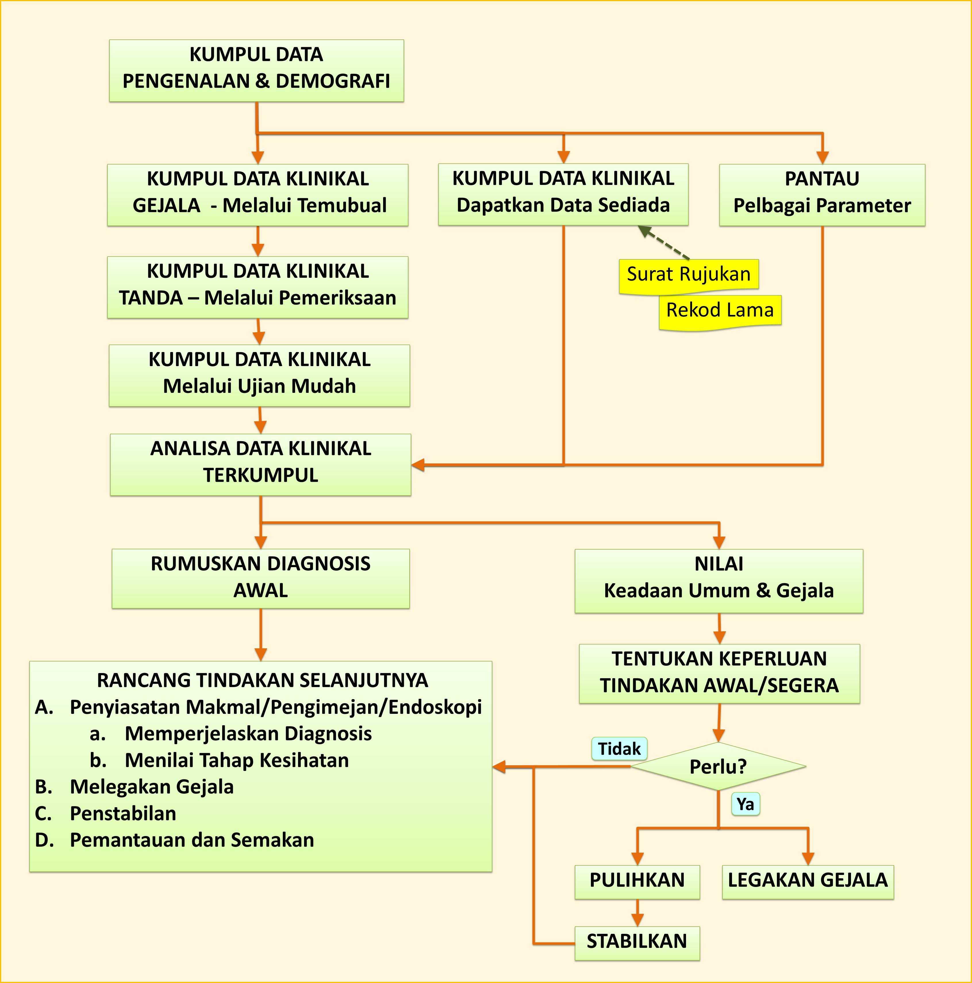 Ketika pesakit mula mula datang untuk mohon rawatan, tugas utama pemberi khidmat klinikal ialah mendapatkan maklumat untuk mengenali profil pesakit tersebut dan mengambiltahu masaalah kesihatan yang dihadapinya. Objektifnya ialah mengenalpasti gejala penyakit, tanda tanda fisikal serta perubahan fisiologi pesakit. Seterusnya maklumat yang terkumpul ditafsirkan untuk merumuskan diagnosis.